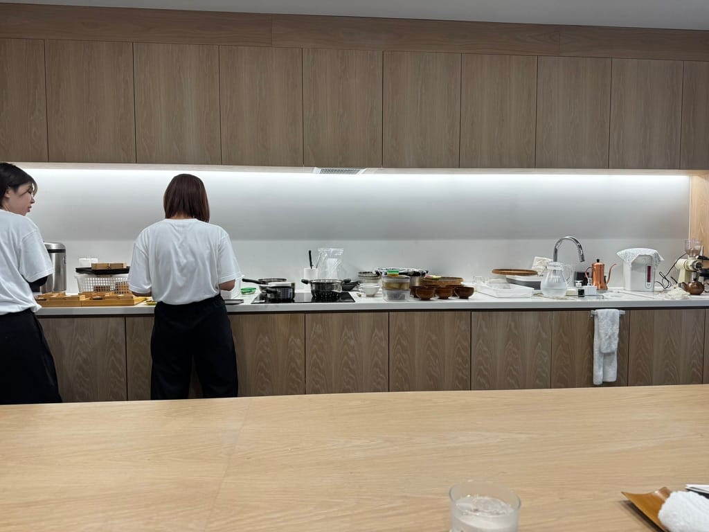 體驗了一汁十菜、坐在吧檯看小姐姐準備料理、飯後甜點
