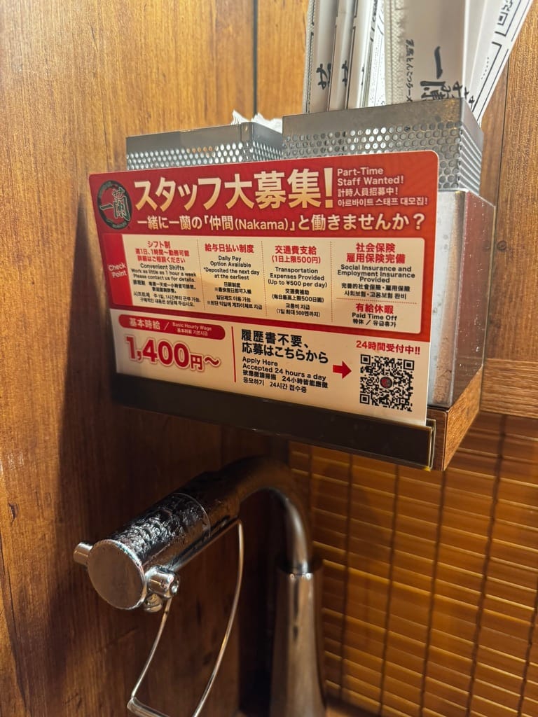 左邊:2024 淺草一蘭拉麵時薪 1400 日圓。右邊:2023 淺草一蘭拉麵時薪 1300 日圓